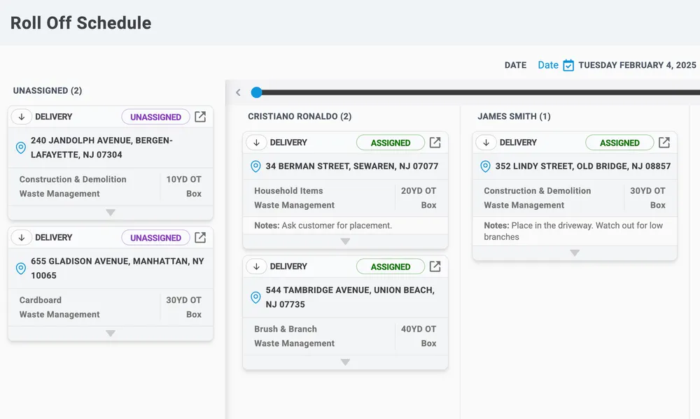 Easily assign orders using an intuitive drag-and-drop interface. Dispatchers can use a board view to assign jobs to drivers, or switch to a list view for detailed schedules and a map view for visual planning.