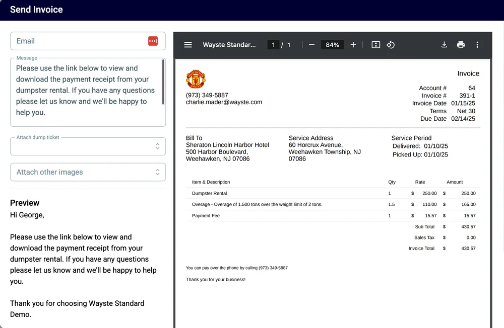 Create invoices effortlessly, including additional charges for overages, materials, or extended rental periods. Ensure every detail is captured and invoices are sent promptly.